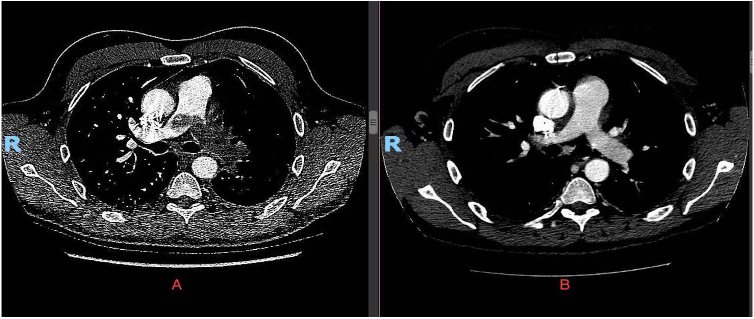 復(fù)查胸部 CT 提示左肺動(dòng)脈充盈缺損較前擴(kuò)大,伴分支血管充盈缺損影像(圖 1)。左肺邊緣呈片狀楔形陰影,提示肺梗死(圖 2)。